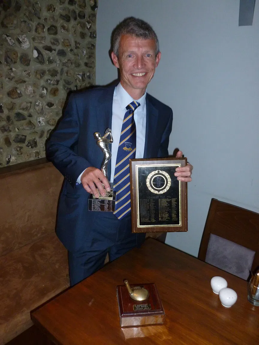 A round dozen for this event with one name winning all four main events, a Society record. In the morning 4 club challenge the winner scored an unbeatable 21 pts. On the ninth in the afternoon, he hit the longest drive (that stayed on the fairway). On the 14th he was only the second person on the green for the nearest the pin. He then pegged back playing partner Pammi Channa who would finish third on 38, and overtook leader in the clubhouse Richard Walsh also on 38. It was Steve Watson scoring 39 who topped it off winning the Stableford Trophy for the full set. Pammi Channa did win the Championship trophy on 121 which is the combination of the 2 rounds in 2012 and those in 2013.